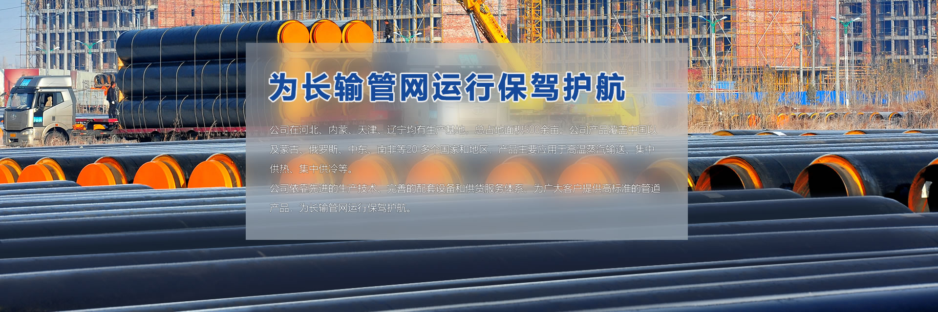 公司在河北、內(nèi)蒙、天津、遼寧均有生產(chǎn)基地,總占地面積500余畝。公司產(chǎn)品覆蓋中國(guó)以及蒙古、俄羅斯、中東、南非等20 多個(gè)國(guó)家和地區(qū),產(chǎn)品主要應(yīng)用于高溫蒸汽輸送、集中供熱、集中供冷等。 公司依靠先進(jìn)的生產(chǎn)技術(shù)、完善的配套設(shè)備和供貨服務(wù)體系,為廣大客戶(hù)提供高標(biāo)準(zhǔn)的管道產(chǎn)品,為長(zhǎng)輸管網(wǎng)運(yùn)行保駕護(hù)航。